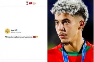 亚西尔·扎比里在Instagram上转发了一条动态:“非洲不配拥有摩洛哥”。看起来,他的言论并非针对裁判、具体判罚或赛事组织,而是对整个非洲大陆的质疑。