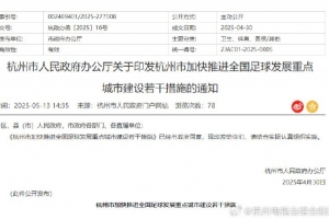 5月13日,《杭州市加快推进全国足球发展重点城市建设若干措施》正式印发,将于2025年6月1日起正式实施。