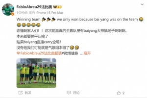 体育资讯5月14日讯 国安球员法比奥晒球队训练胜利小分队合照,并调侃了柏杨。
